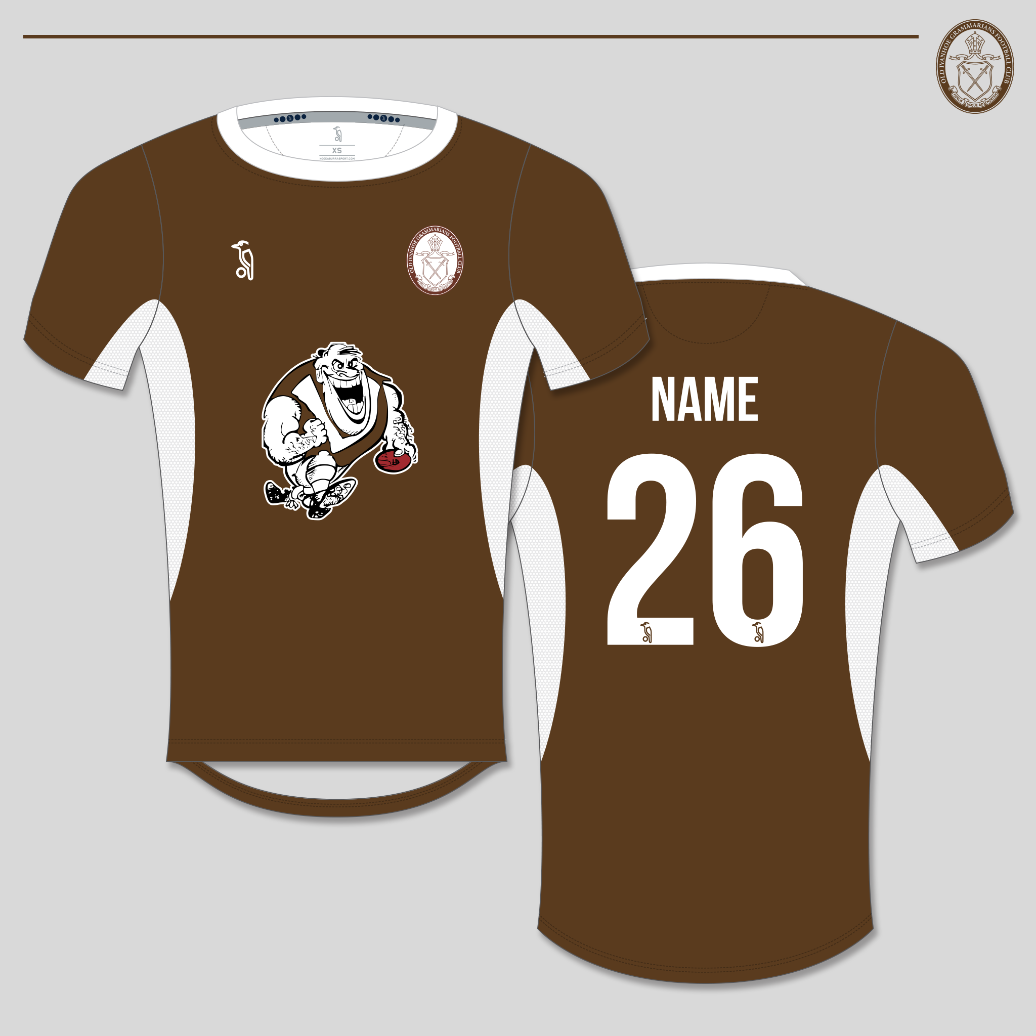 Design: Chocolate body, White trim, Mascot graphic on chest.
